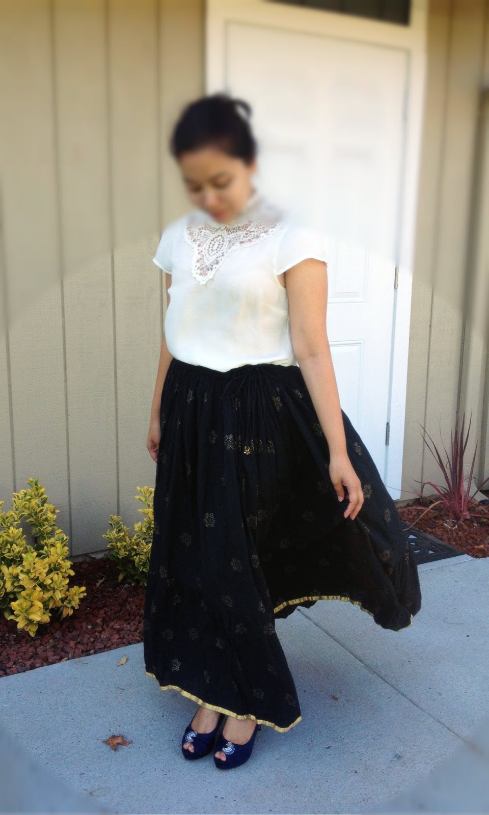 I have paired it with a black and gold ethnic Indian maxi skirt and a pair of satin blue pumps. I love the way this skirt ruffles when I move.Having fun with dressing up as always! Have a great day and week ahead!
